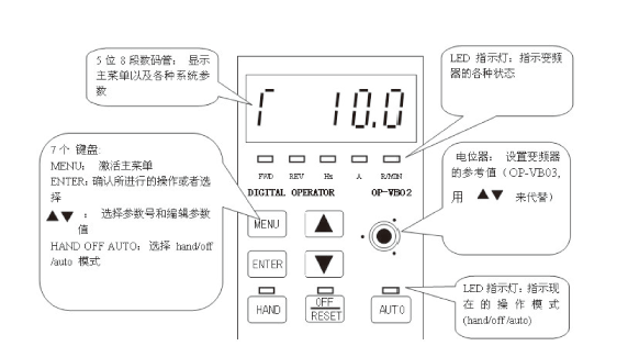海利普變頻器的參數(shù)通過面板來進行設置。面板和使用步驟如下圖: