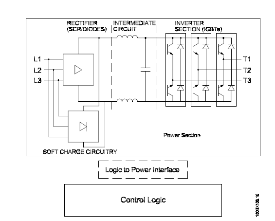 電壓在經過整流器部分后,便會到達中間部分。整流電壓通過由直流總線感應器和直流總線電容器組組成的正弦波濾波器電路進行平抑。