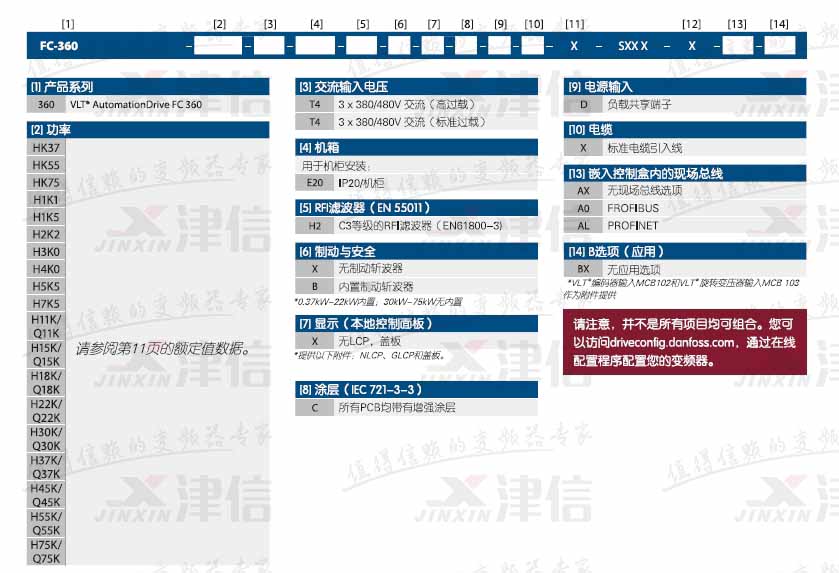 如FC360H1K5T4E20H2BXCDXXSXXXXALBX,代表380V,1.5KW,IP20,C3等級內置濾波器,內置制動,PROFINET現(xiàn)場總線
