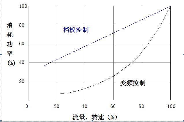 交流驅(qū)動系統(tǒng)實際使用時,可通過實測或根據(jù)其靜態(tài)特性的理論計算,作出其轉(zhuǎn)速對功率的特性曲線,由于轉(zhuǎn)速與流量成正比,該曲線即流量對功率的特性,如圖1所示。與檔板調(diào)節(jié)相比較,可見其節(jié)能是顯著的。