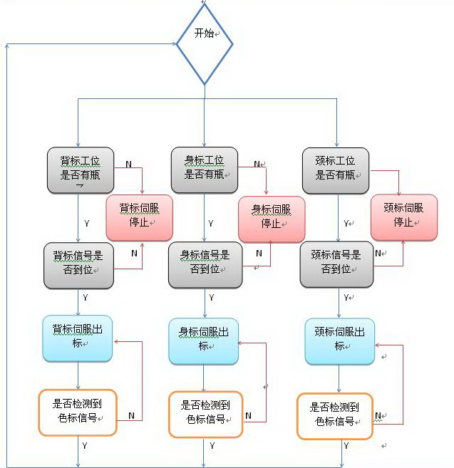 啤酒貼標(biāo)機由進(jìn)瓶傳送帶、主軸、出瓶傳送帶、貼標(biāo)伺服及各個位置傳感器組成。當(dāng)設(shè)備運行時,系統(tǒng)會檢測當(dāng)前貼標(biāo)工位是否有瓶子,如有,則對應(yīng)得貼標(biāo)伺服開始動作。例如當(dāng)系統(tǒng)檢測到背標(biāo)工位上有瓶子,且貼標(biāo)有貼標(biāo)信號時,則貼標(biāo)伺服開始動作,由色標(biāo)檢測傳感器來結(jié)束貼標(biāo)動作,身標(biāo)與頸標(biāo)動作與背標(biāo)一致。
