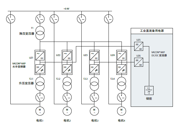 通過采用低壓水冷變頻器并結合“降壓-升壓”方案,來驅動中壓電機,IC-ART 和丹佛斯共同開發的直流備用電源系統來保證主電晃電或故障時的可靠持續運行